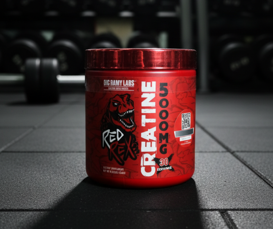 BigRam Labs Red Rex Creatine كرياتين مونوهيدرات مع تصميم ديناصور T-Rex مميّز، يدعم زيادة القوة والأداء المتفجّر في التمارين الثقيلة، مثالي للاعبي كمال الأجسام اللي عايزين كرياتين قوي بجرعات كبيرة وتصميم جذاب.