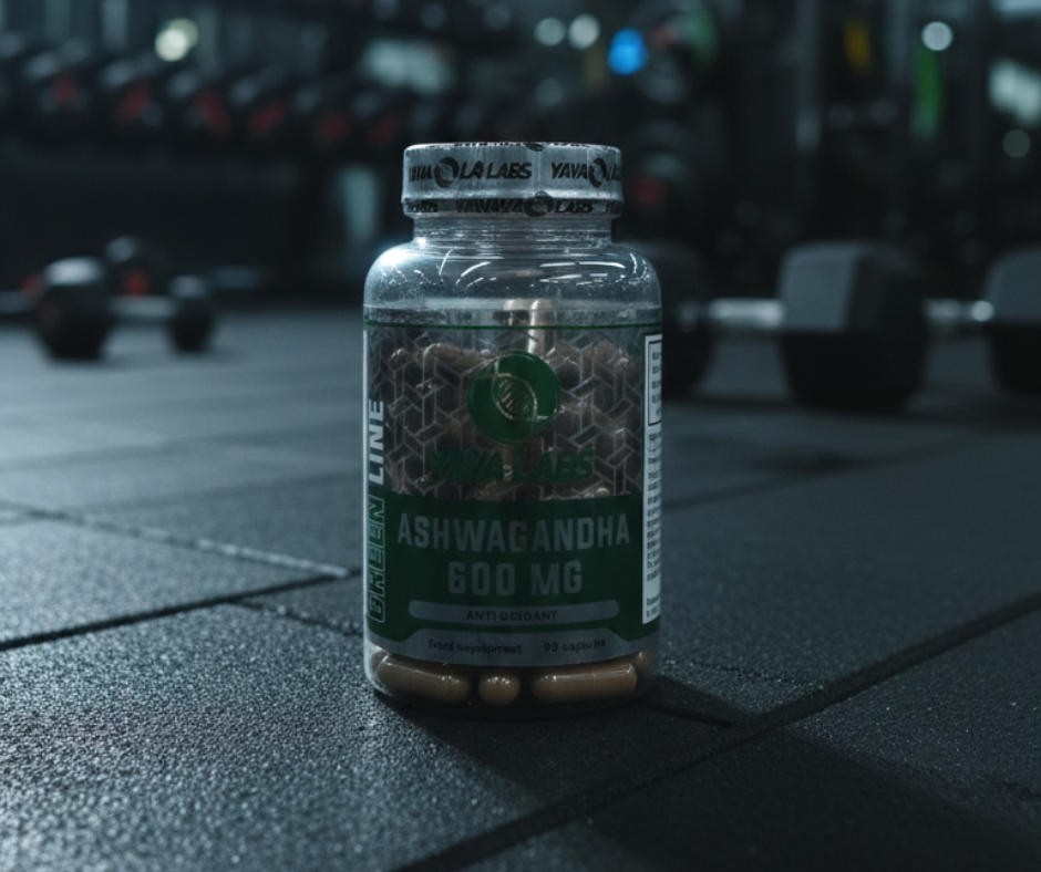 لمنتج Ashwagandha 600mg من YAVA LABS موضوع على أرضية جيم، في أجواء رياضية تعكس القوة والتركيز. العبوة ممسوكة باليد مع خلفية محايدة، ما يجعل المنتج واضحًا وبارزًا بشكل أنيق. التصميم المعدني مع اللون الأخضر يعطي إحساسًا بالاحتراف والجودة العالية، ويعكس طابع المكملات المخصصة للرياضيين ونمط الحياة النشط.