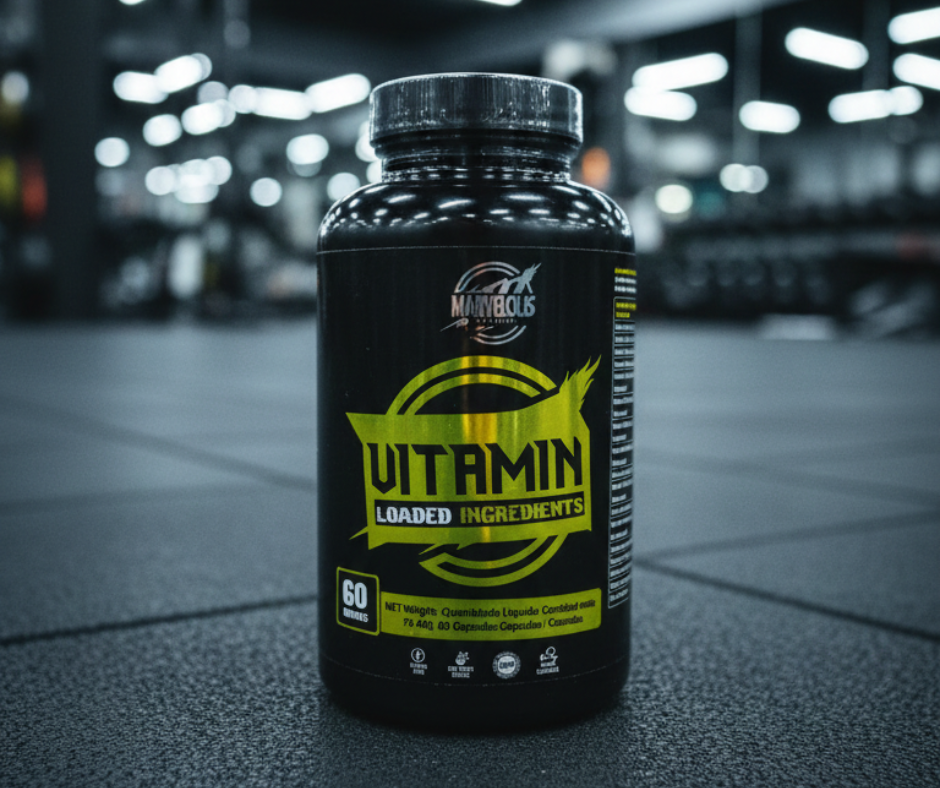Vitamin – Loaded Ingredients موضوع على أرضية جيم، في بيئة رياضية تعكس القوة والاستعداد للتمرين. العبوة ممسوكة باليد مع خلفية أرفف مكملات غذائية، ما يبرز المنتج بشكل واضح وأنيق. التصميم الأسود مع الأصفر يعطي إحساسًا بالقوة والتركيز، ويعكس طابع مكملات الأداء المخصصة للرياضيين ومحترفي الجيم.